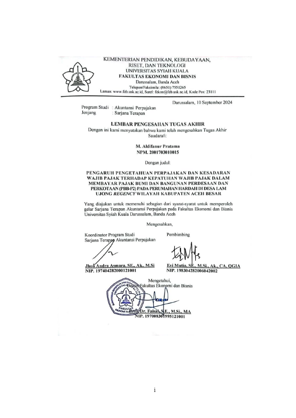 M. Aldifanur Pratama, PENGARUH PENGETAHUAN PERPAJAKAN DAN KESADARAN WAJIB PAJAK TERHADAP KEPATUHAN WAJIB PAJAK DALAM MEMBAYAR PAJAK BUMI DAN BANGUNAN PERDESAAN DAN PERKOTAAN (PBB-P2) PADA PERUMAHAN HADRAH DI DESA LAM UJONG REGENCY WILAYAH KABUPATEN ACEH BESAR. Banda Aceh Fakultas Ekonomi dan Bisnis Akuntansi (S1),2024