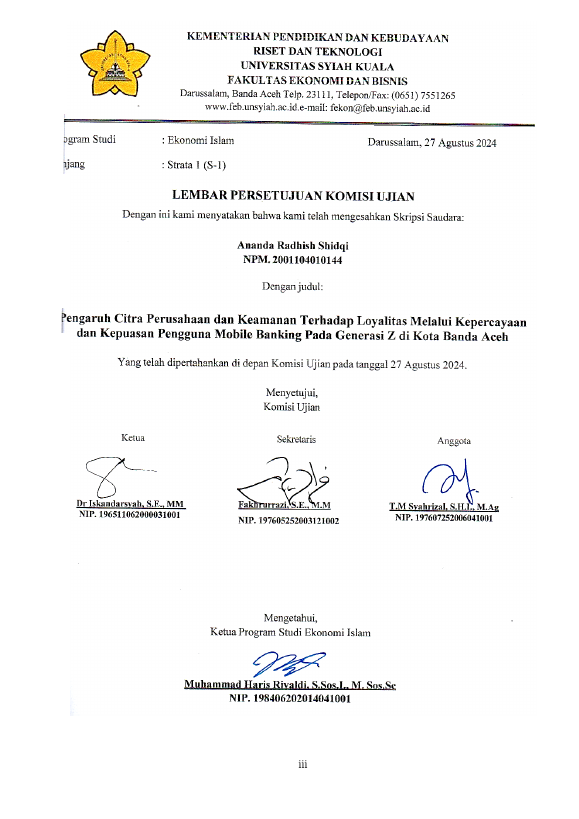 Ananda Radhish Shidqi, PENGARUH CITRA PERUSAHAAN DAN KEAMANAN TERHADAP LOYALITAS MELALUI KEPERCAYAAN DAN KEPUASAN PENGGUNA MOBILE BANKING PADA GENERASI Z DI KOTA BANDA ACEH. Banda Aceh ,2024