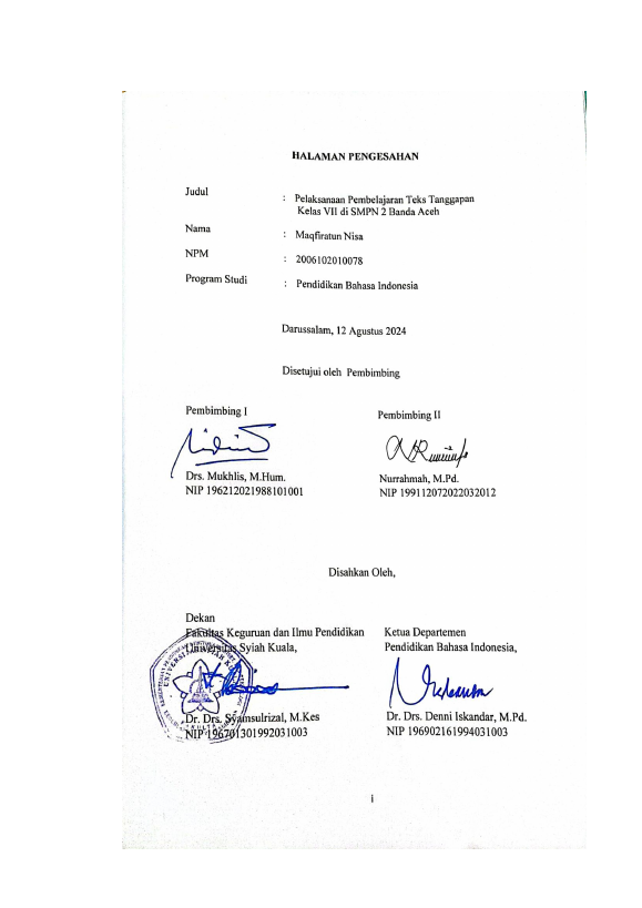 MAQFIRATUN NISA, PELAKSANAAN PEMBELAJARAN TEKS TANGGAPAN RNKELAS VII DI SMPN 2 BANDA ACEH. Banda Aceh ,2024