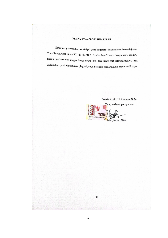 MAQFIRATUN NISA, PELAKSANAAN PEMBELAJARAN TEKS TANGGAPAN RNKELAS VII DI SMPN 2 BANDA ACEH. Banda Aceh ,2024