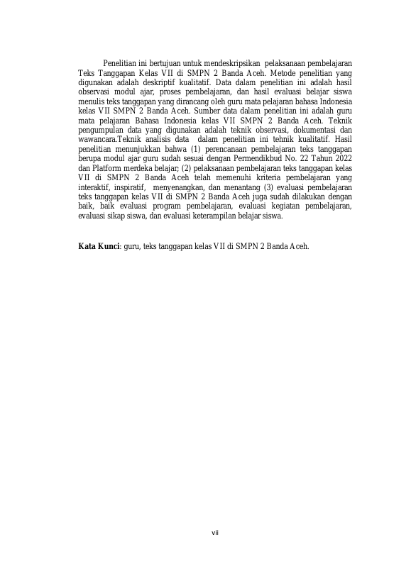MAQFIRATUN NISA, PELAKSANAAN PEMBELAJARAN TEKS TANGGAPAN RNKELAS VII DI SMPN 2 BANDA ACEH. Banda Aceh ,2024