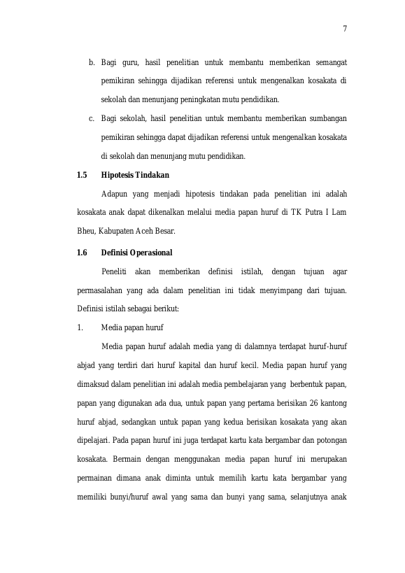 Nurul Shahira, PENGGUNAAN MEDIA PAPAN HURUF UNTUK MENGENALKAN KOSAKATA ANAK USIA DINI DI TK PUTRA I LAM BHEU ACEH BESAR. Banda Aceh Fakultas KIP,2024