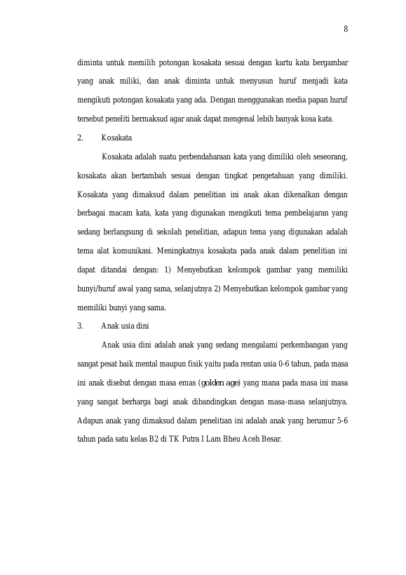 Nurul Shahira, PENGGUNAAN MEDIA PAPAN HURUF UNTUK MENGENALKAN KOSAKATA ANAK USIA DINI DI TK PUTRA I LAM BHEU ACEH BESAR. Banda Aceh Fakultas KIP,2024