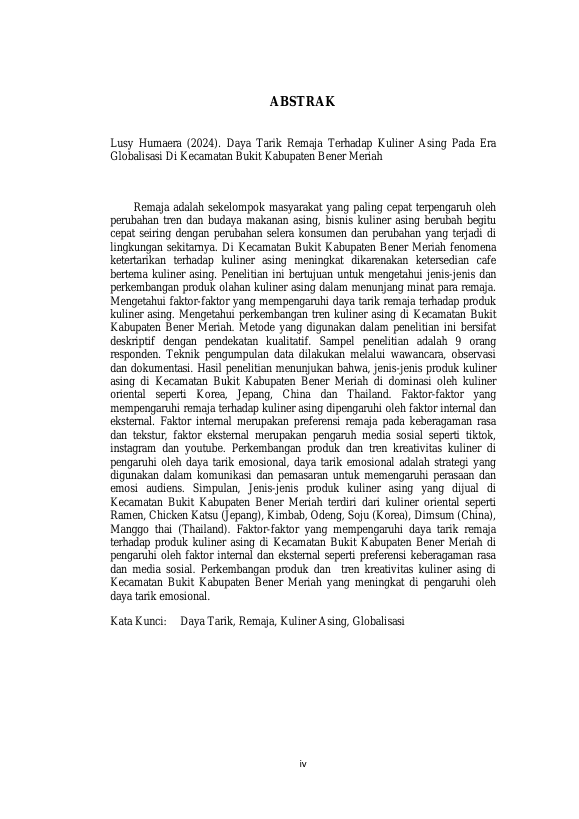 LUSY HUMAERA, DAYA TARIK REMAJA TERHADAP KULINER ASING PADA ERA GLOBALISASI DI KECAMATAN BUKIT KABUPATEN BENER MERIAH. Banda Aceh Fakultas FKIP (S1),2024