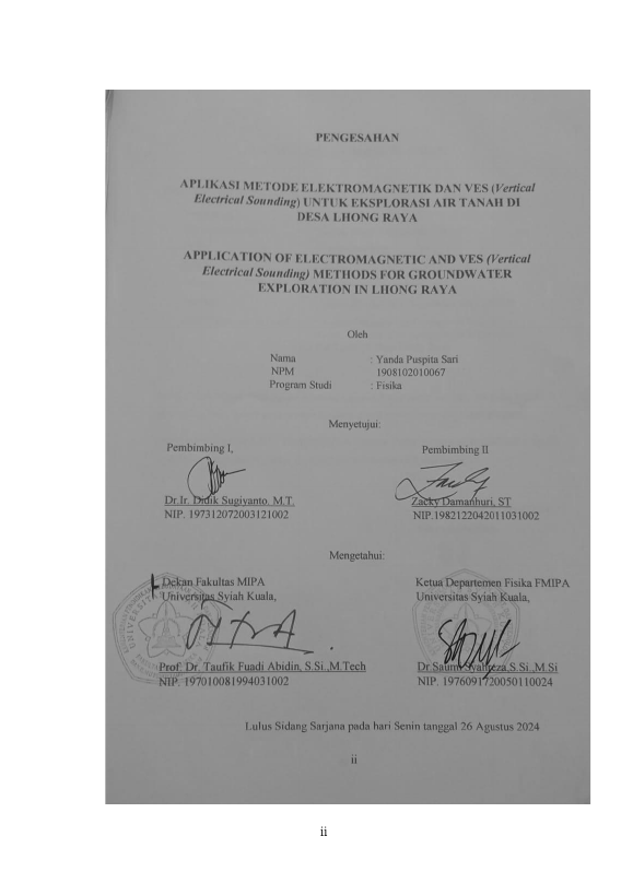 Yanda Puspita Sari, APLIKASI METODE ELEKTROMAGNETIK DAN VES (VERTICAL RNELECTRICAL SOUNDING) UNTUK EKSPLORASI AIR TANAH DI RNDESA LHONG RAYA. Banda Aceh Fakultas mipa,2024