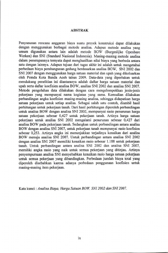 Amir Hidayat, KAJIAN HARGA SATUAN PEKERJAAN BANGUNAN GEDUNG BERDASARKAN ANALISA BOW, SNI 2002 DAN SNI 2007. Banda Aceh Fakultas Teknik,2010