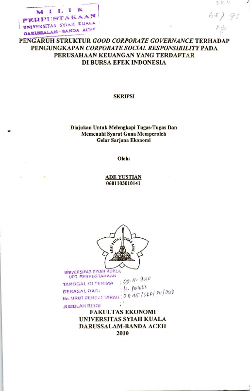 Ade Yustian, PENGARUH STRUKTUR GOOD CORPORATE GOVERNANCE TERHADAP PENGUNGKAPAN CORPORATE SOCIAL RESPONSIBILITY PADA PERUSAHAAN KEUANGAN YANG TERDAFTARRNDI BURSA EFEK INDONESIA. Banda Aceh Fakultas Ekonomi,2010