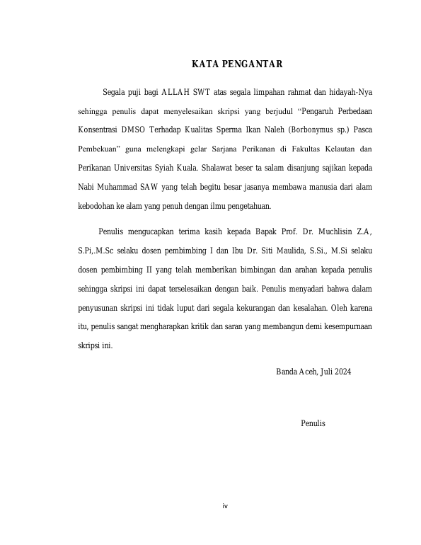 DIANI, PENGARUH PERBEDAAN KONSENTRASI DIMETIL SULFOKSIDA (DMSO) TERHADAP KUALITAS SPERMA IKAN NALEH (BARBONYMUS SP.) PASCA PEMBEKUAN. Banda Aceh Fakultas Kelautan dan Perikanan (S1),2024