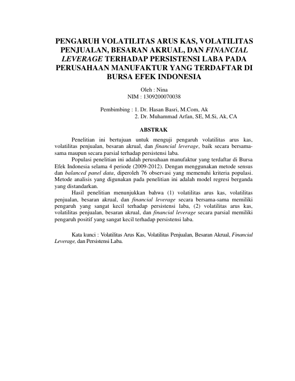 Baca Juga : PENGARUH VOLATILITAS ARUS KAS, VOLATILITAS PENJUALAN, BESARAN AKRUAL, DAN FINANCIAL LEVERAGE TERHADAP PERSISTENSI LABA PADA PERUSAHAAN MANUFAKTUR YANG TERDAFTAR DI RNBURSA EFEK INDONESIA (Nina, 2015)