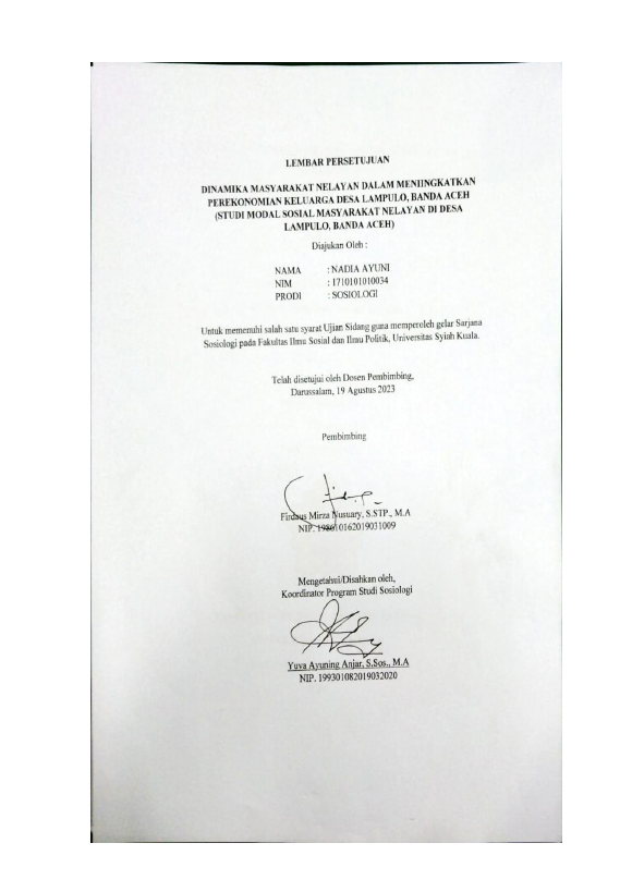NADIA AYUNI, MODAL SOSIAL MASYARAKAT NELAYAN DALAM MENINGKATKAN PEREKONOMIAN KELUARGA DI GAMPONG LAMPULO KOTA BANDA ACEH. Banda Aceh Fakultas Ilmu Sosial dan Ilmu Politik Sosiologi,2024