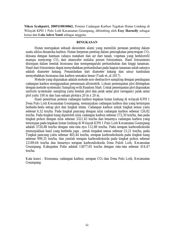 Niken Syahputri, POTENSI CADANGAN KARBON TEGAKAN HUTAN LINDUNG DI WILAYAH KPH I PULO LOIH KECAMATAN GEUMPANG. Banda Aceh Fakultas Pertanian Kehutanan,2024