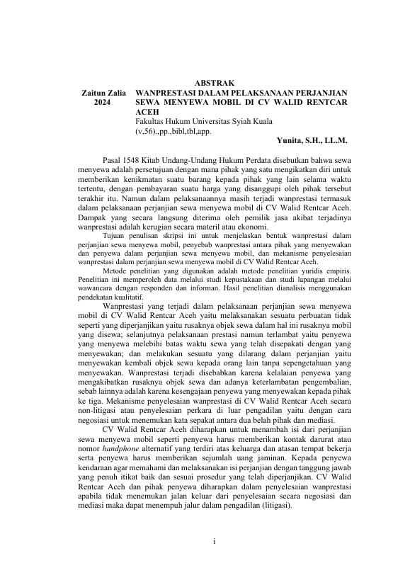 Zaitun Zalia, WANPRESTASI DALAM PELAKSANAAN PERJANJIAN SEWA MENYEWA MOBIL DI CV WALID RENTCAR ACEH. Banda Aceh Fakultas Hukum,2024