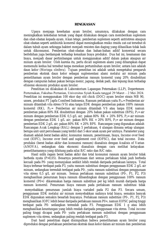 Baca Juga : PERUBAHAN KADAR LEMAK ABDOMEN AYAM BROILER (GALLUS SP.) YANG DIBERI RANSUM FERMENTASI DAUN KELOR (MORINGA OLEIFERA LAMK) (Intan Firdaus, 2016)
