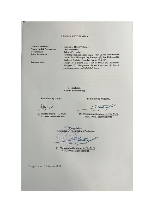 FERDIANTO HERRI YOLANDA, RANCANG BANGUN ALAT RAPID TEST UNTUK MENDETEKSI UNSUR HARA NITROGEN (N), PHOSPOR (P) DAN KALIUM (K) BERBASIS ARDUINO UNO DAN SENSOR SOIL NPK. Banda Aceh Fakultas Pertanian,2024