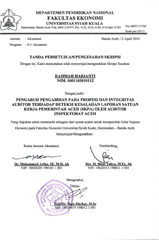 Rahmah Harianti, PENGARUH PENGABDIAN PADA PROFESI DAN INTEGRITAS AUDITOR TERHADAP DETEKSI KESALAHAN LAPORAN SATUAN KERJA PEMERINTAH ACED (SKPA) OLEH AUDITOR INSPEKTORAT ACEH. Banda Aceh Fakultas Ekonomi,2010
