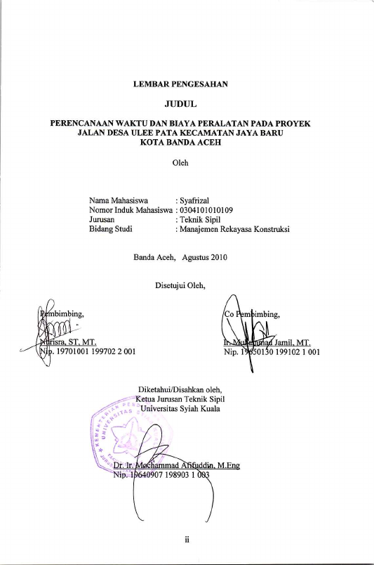 Syafrizal, PERENCANAAN WAKTU DAN BIAYA PERALATAN PADA PROYEK JALAN DL DESA ULEE PATA KECAMATAN JAYA BARURNKOTA BANDA ACEH. Banda Aceh Fakultas Teknik,2010
