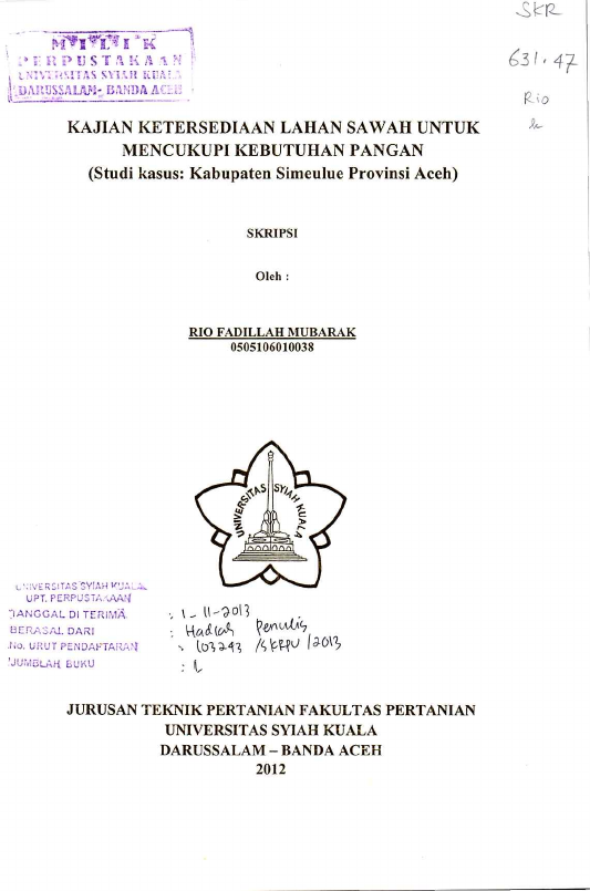 Rio Fadillah Mubarak, KAJIAN KETERSEDIAAN LAHAN SAWAH UNTUK MENCUKUPI KEBUTUHAN PANGAN (STUDI KASUS : KABUPATEN SIMEULUE PROVINSI ACEH). Banda Aceh Fakultas Pertanian,2012