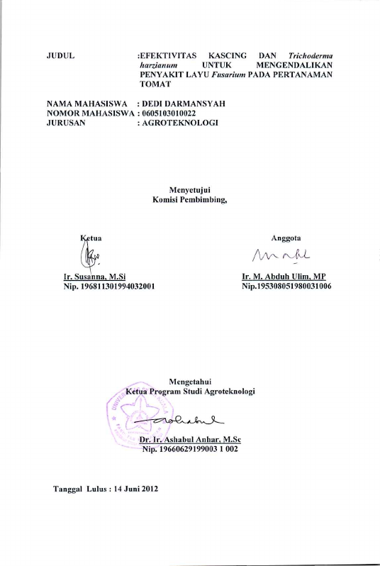 Dedi Darmansyah, EFEKTIVITAS KASCING DAN TRICHODERMA HARZIANUM UNTUK MENGENDALIKAN PENYAKIT LAYU FUSARIUM PADA PERTANAMAN TOMAT. Banda Aceh Fakultas Pertanian,2012