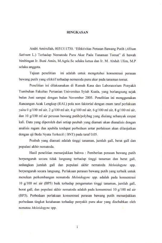 Ansri Amirullah, EFEKTIVITAS PERASAN BAWANG PUTIH (ALLIUMSATIVUM L.) TERHADAP NEMATODA PURU AKAR PADA TANAMAN TOMAT. Banda Aceh Fakultas Pertanian,2006