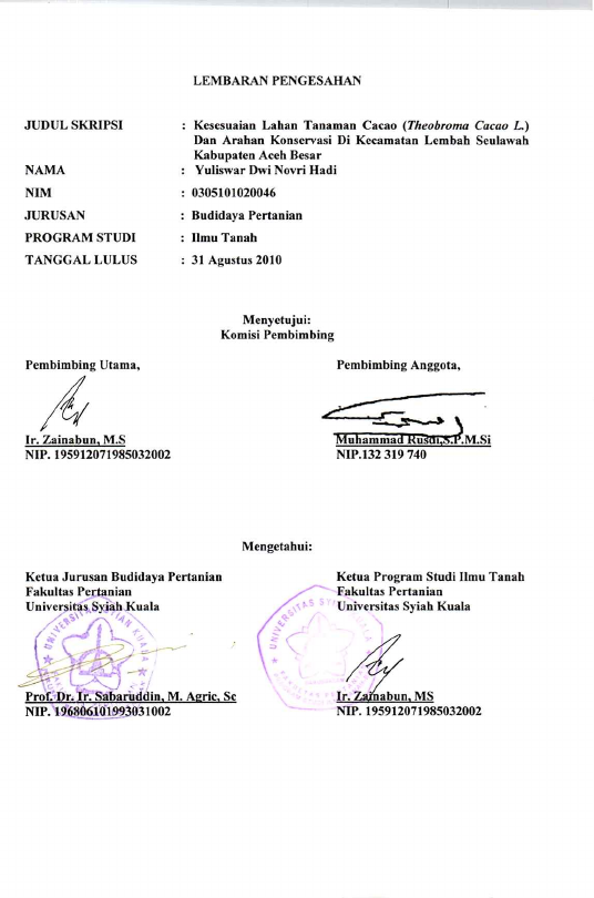 Yuliswar Dwi Novriadi, KESESUAIAN LAHAN TANAMAN KAKAO (THEOBROMA CACAO L) DAN ARAHAN KONSERVASI DI KECAMATAN LEMBAH SEULAWAH KABUPATEN ACEH BESAR. Banda Aceh Fakultas Pertanian,2010