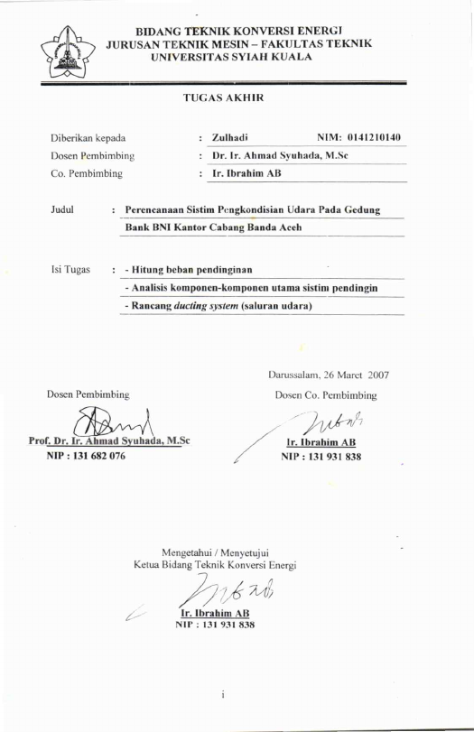 Zulhadi, PERENCANAAN SISTIM PENGKONDISIAN UDARA PADA GEDUNG BANK BNI KANTOR CABANG BANDA ACEH. Banda Aceh Fakultas Teknik,
