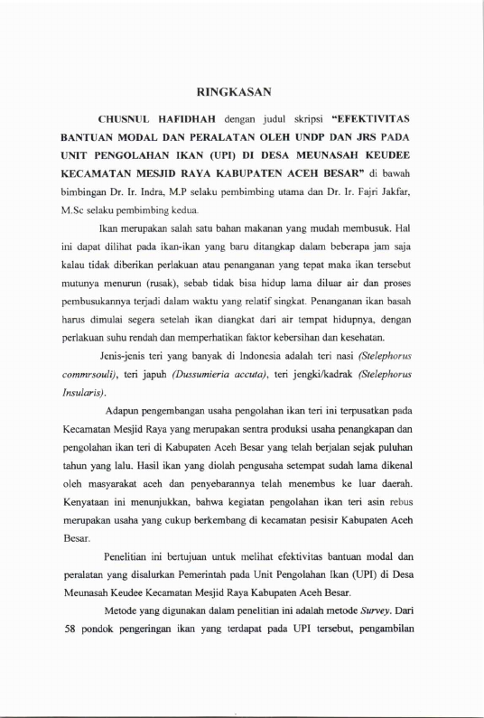 Chusnul Hafidhah, EFEKTIVITAS BANTUAN MODAL DAN PERALATAN OLEH UNDP DAN JRS PADA UNIT PENGOLAHAN IKAN (UPI) DI DESA MEUNASAH KEUDEE KECAMATAN MESJID RAYA KABUPATEN ACEH BESAR. Banda Aceh Fakultas Pertanian Universitas Syiah Kuala,