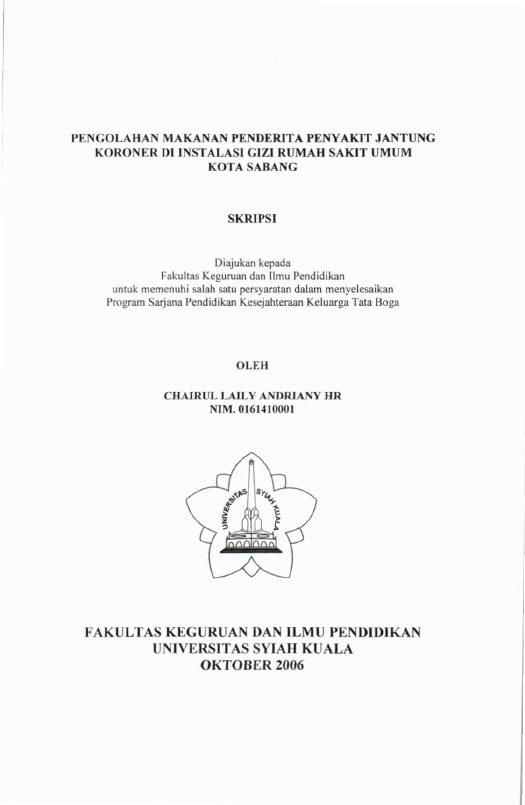 Chairul Laily Andriany HR, PENGOLAHAN MAKANAN PENDERITA PENYAKIT JANTUNG KOLONER DI INSTALASI GIZI RUMAH SAKIT UMUM KOTA SABANG. Banda Aceh Fakultas Keguruan dan Ilmu Pendidikan-Universitas Syiah Kuala,