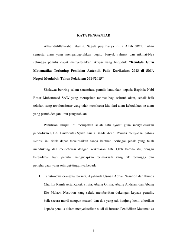 FATMA ELIZA NASUTION, KENDALA GURU MATEMATIKA TERHADAP PENILAIAN AUTENTIK PADA KURIKULUM 2013 DI SMA NEGERI KOTA MEULABOH TAHUN PELAJARAN 2014/2015. Banda Aceh Fakultas Keguruan dan Ilmu Pendidikan,2015
