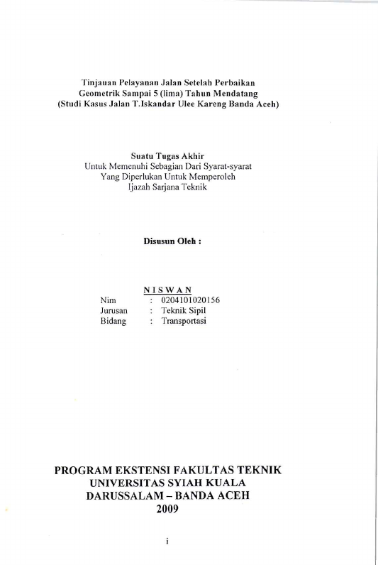 Niswan, TINJAUAN PELAYANAN JALAN SETELAH PERBAIKAN GEOMETRIK SAMPAI 5 (LIMA) TAHUN MENDATANG (STUDI KASUS PADA JALAN T. ISKANDAR ULEE KARENG BANDA ACEH). Banda Aceh Fakultas Teknik,2009