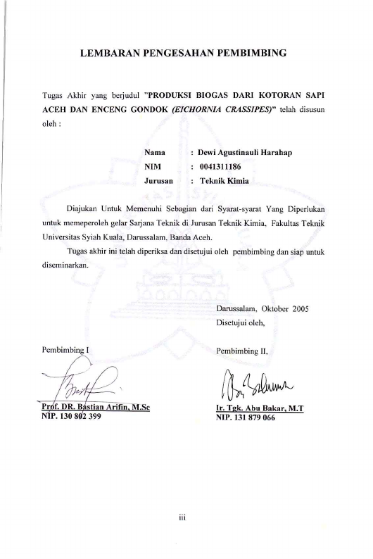 Dewi Agustinauli harahap, PRODUKSI BIOGAS DARI KOTORAN SAPI ACEH DAN ENCENG GONDOK (EICHORNIA CRASSIPES). Banda Aceh Fakultas Teknik,2005