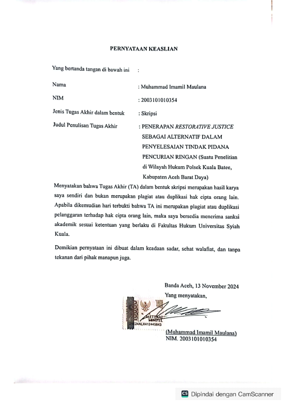 Baca Juga : PENYELESAIAN TINDAK PIDANA PENCURIAN MELALUI RESTORATIVE JUSTICE DI WILAYAH HUKUM KEJAKSAAN NEGERI BANDA ACEH (Nadila Sabana Yg, 2024)