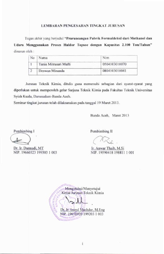 Baca Juga : PRARANCANGAN PABRIK FORMALIN DARI METANOL DAN UDARA MENGGUNAKAN PROSES HALDOR TOPSOE DENGAN KAPASITAS 25.000 TON PER TAHUN (M. Salman Fauzan, 2016)