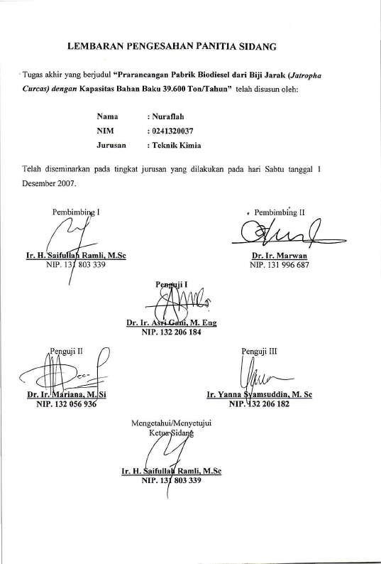 Nuraflah, PRARANCANGAN PABRIK BIODIESEL DARI BIJI JARAK (JATROPHA CURCAS) DENGAN KAPASITAS BAHAN BAKU 39.600 TON/TAHUN. Banda Aceh Fakultas Teknik,2007
