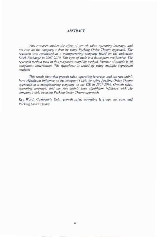 Roza Raithari, PENGARUH PERTUMBUHAN PENJUALAN, OPERATING LEVERAGE, DAN TAX RATE TERHADAP KEBIJAKAN HUTANG DENGAN PENDEKATAN PECKING ORDER THEORY PADA PERUSAHAAN MANUFAKTUR DI BURSA EFEK INDONESIA TAHUN 2007-2010. Banda Aceh Fakultas Ekonomi,2012