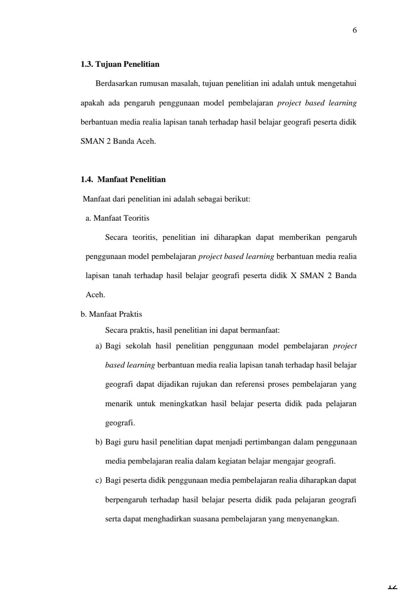 PUTRI FIRJANNAH, PENGARUH PENGGUNAAN MODEL PEMBELAJARAN PROJECT BASED LEARNING BERBANTUAN MEDIA REALIA LAPISAN TANAH TERHADAP HASIL BELAJAR GEOGRAFI PESERTA DIDIK SMAN 2 BANDA ACEH. Banda Aceh Fakultas KIP Pendidikan Geografi,2024