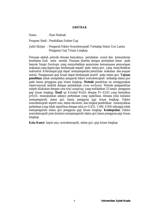 Baca Juga : PENGARUH FAKTOR SOSIODEMOGRAFI TERHADAP STATUS GIZI LANSIA PENGGUNA GIGI TIRUAN SEBAGIAN LEPASAN (GTSL) DI RSGM USK (Amalia Mahara, 2023)