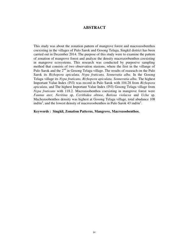 Sabila Rizka, POLA ZONASI HUTAN MANGROVE SERTA RNMAKROZOOBENTHOS YANG BERKOESISTENSI DI DESA RNPULO SAROK DAN DESA GOSONG TELAGA KABUPATEN RNACEH SINGKIL. Banda Aceh Universitas Syiah Kuala,2015