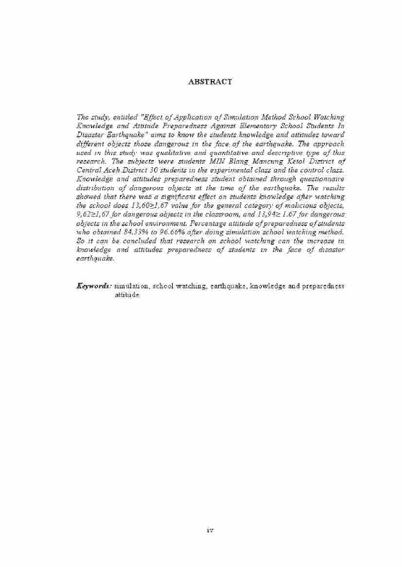 Baca Juga : PENGARUH METODE SIMULASI PENGURANGAN RISIKO BENCANA TERHADAP KESIAPSIAGAAN SISWA SEKOLAH DASAR DALAM MENGHADAPI ANCAMAN BENCANA GEMPA BUMI DI SD ULEE PAYA PULO BREUH RNACEH BESAR (POCUT ZAIRIANA FINZIA, 2015)