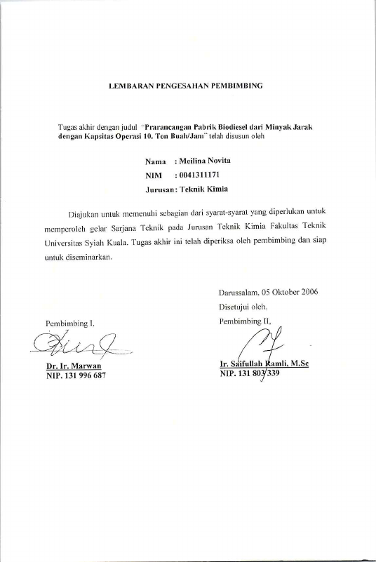 Meilina novita, PRARANCANGAN PABRIK BIODIESEL DARI MINYAK JARAK DENGAN KAPASITAS OPERASI 10 TON BUAH/JAM. Banda Aceh Fakultas Teknik,