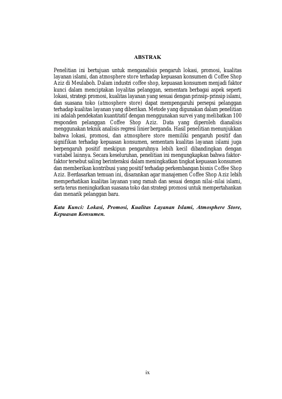 Elviri Zahwa, PENGARUH LOKASI, PROMOSI, KUALITAS LAYANAN ISLAMI, DAN ATMOSPHERE STORE TERHADAP KEPUASAN KONSUMEN COFFEE SHOP AZIZ DI MEULABOH. Banda Aceh Fakultas Ekonomi Islam,2024