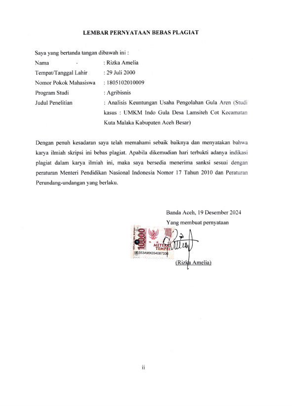 Rizka Amelia, ANALISIS KEUNTUNGAN USAHA PENGOLAHAN GULA AREN (STUDI KASUS : UMKM INDO GULA DESA LAMSITEH COT KECAMATAN KUTA MALAKA KABUPATEN ACEH BESAR). Banda Aceh Fakultas Pertanian Agribisnis (S1),2024