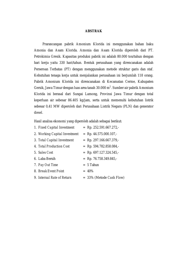 Baca Juga : PRARANCANGAN PABRIK AMONIUM KLORIDA DARI AMONIUM SULFAT DAN NATRIUM KLORIDA DENGAN KAPASITAS PRODUKSI 100.000 TON/TAHUN (Rahmadin, 2022)