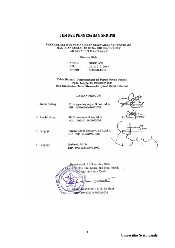 SURIYATI, PREFERENSI DAN PEMAKNAAN MASYARAKAT PENERIMA BANTUAN SOSIAL DI DESA KRUENG KLUET: ANTARA BLT DAN ZAKAT. Banda Aceh Fakultas Ilmu Sosial dan Politik,2025