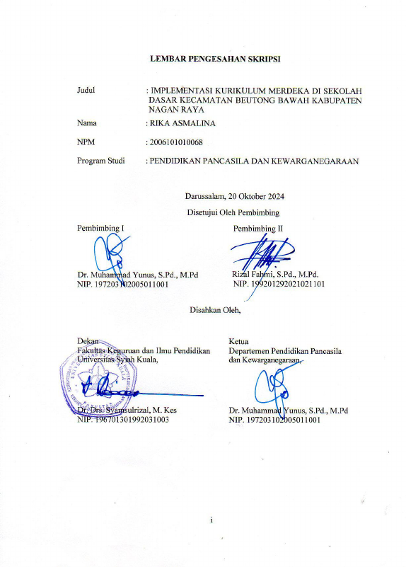 RIKA ASMALINA, IMPLEMENTASI KURIKULUM MERDEKA DI SEKOLAH DASAR KECAMATAN BEUTONG BAWAH KABUPATEN NAGAN RAYA. Banda Aceh Fakultas KIP PPKN,2025
