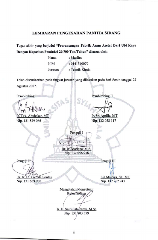 Muslim, PRARANCANGAN PABRIK ASAM ASETAT DARI UBI KAYU DENGAN KAPASITAS PRODUKSI 29.700 TON/TAHUN. Banda Aceh Fakultas Teknik,2007