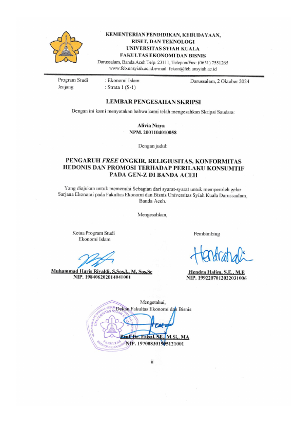 ALIVIA NISYA, PENGARUH FREE ONGKIR, RELIGIUSITAS, KONFORMITAS HEDONIS DAN PROMOSI TERHADAP PERILAKU KONSUMTIF PADA GEN-Z DI BANDA ACEH. Banda Aceh Fakultas Ekonomi Islam,2025