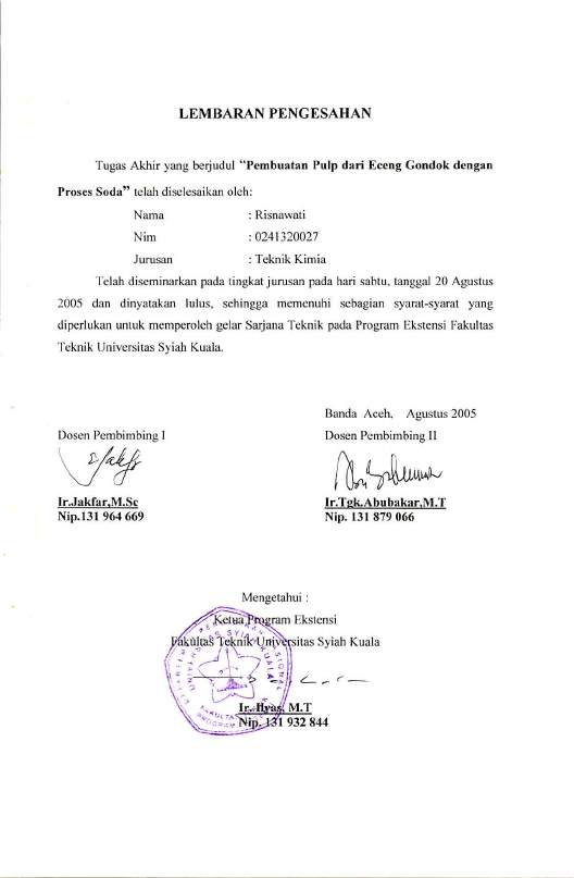 Risnawati, PEMBUATAN PULP DARI ECENG GONDOK DENGAN PROSES SODA. Banda Aceh Fakultas Teknik,2005