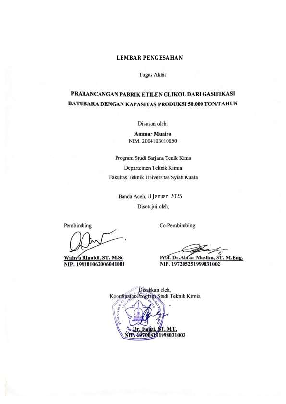 Ammar Munira, PRARANCANGAN PABRIK ETILEN GLIKOL DARI GASIFIKASI BATUBARA DENGAN KAPASITAS PRODUKSI 50.000 TON/TAHUN. Banda Aceh Fakultas Teknik Kimia,2025