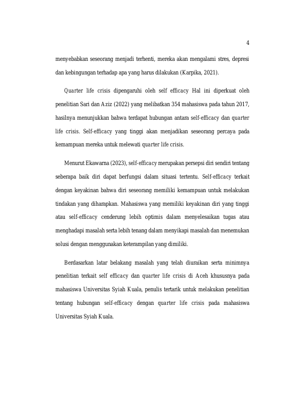 Baca Juga : HUBUNGAN SELF EFFICACY DENGAN QUARTER LIFE CRISIS PADA MAHASISWA UNIVERSITAS SYIAH KUALA (FITRI MAGHFIRATI YURIZA, 2025)