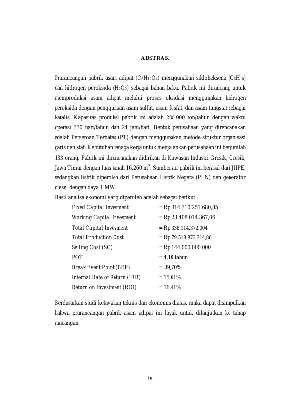 Baca Juga : PRARANCANGAN PABRIK ASAM ADIPAT DARI SIKLOHEKSANA DAN HIDROGEN PEROKSIDA DENGAN KAPASITAS 200.000 TON/TAHUN (Syifa Murran Mirza, 2024)